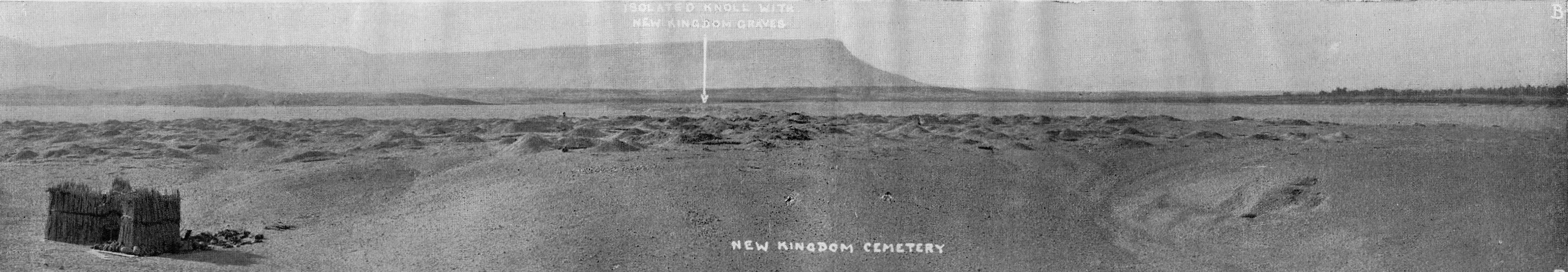 The cemeteries are located behind the most southern village in the district which is known as Balabish on a triangular ridge adjacent to a wadi. The densely packed New Kingdom cemetery is not separated from the southern most pan-graves but has been heavily looted. To the north of this cemetery, is a Coptic burial site which includes rock-cut tombs which had also been plundered in antiquity. The pan-grave cemetery was untouched and adjacent to the New Kingdom cemetery.
